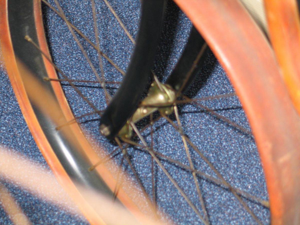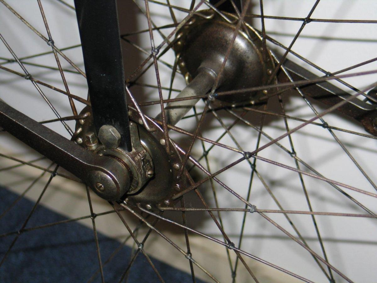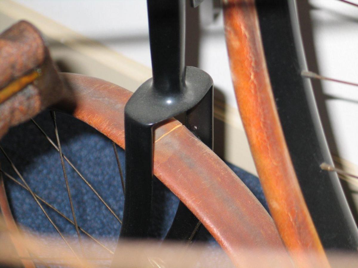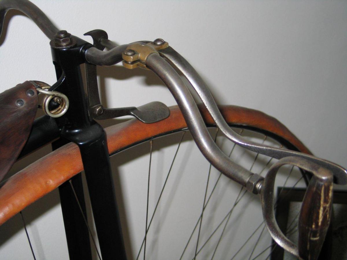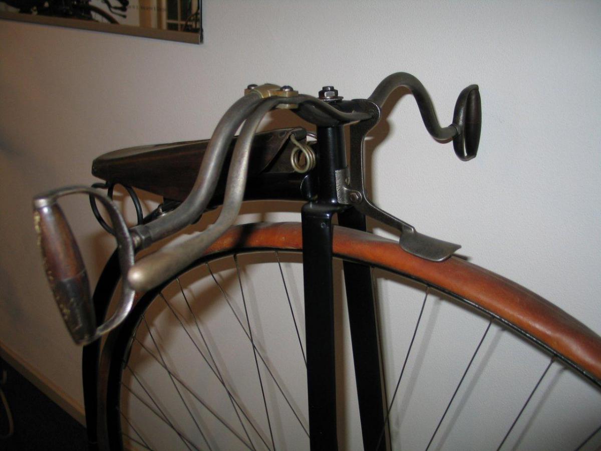 I am not sure if the tires of this 1891 Rudge have been renewed, but I guess so. It is a unique bike and different from the other Rudge bikes I have seen from that period. Look at the broad rims and the brake spoon! The brake spoon turning point has been screwed onto the head. Spade grips and saddle make it look like an American bike. It sure must have been a very special ride!